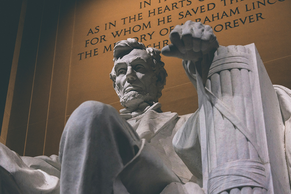 Abraham Lincoln i Lincoln Memorial i Washington D.C., där monumentets inskription hyllar honom som den som “räddade unionen”. Foto: Adobe