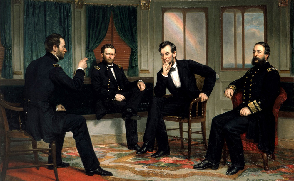Abraham Lincoln tillsammans med generalerna William T. Sherman, Ulysses S. Grant och amiral David D. Porter under inbördeskriget. Målning av George P. A. Healy, 1868 (Public domain). Foto: Adobe