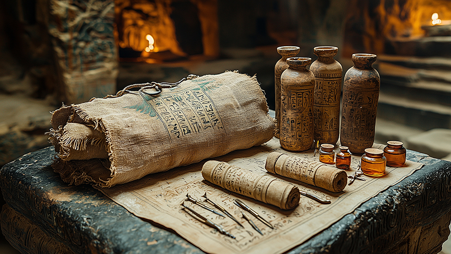 En egyptisk läkarsäck med örter och medicinska skrifter. Redan för flera tusen år sedan beskrev man symtom som i dag känns igen som diabetes.